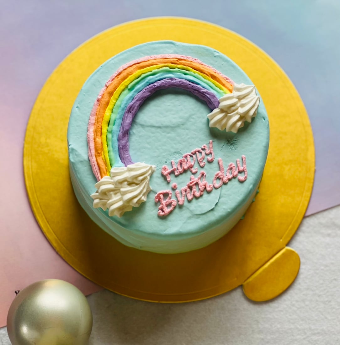 お空に見立てたホールのケーキに虹のデコレーションをあしらいました!
